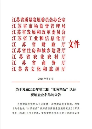 “江蘇精品”品牌認證工作于2020年啟動,是省委省政府實施創新驅動發展戰略、發展品牌經濟、推動經濟社會高質量發展的一項重要舉措,由江蘇省質量發展委員會辦公室聯合江蘇省市場監督管理局等八個部門共同評定。“江蘇精品”是江蘇企業的區域品牌,不僅代表著高質量的江蘇產品(服務),還代表著江蘇信譽、江蘇形象、江蘇文化、江蘇實力。