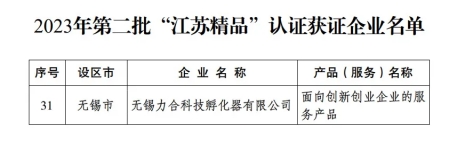 日前,2023年第二批“江蘇精品”認證獲證產品(服務)名單出爐,無錫力合科技孵化器“面向創新創業企業的服務產品”通過“江蘇精品”認證。